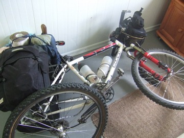 Durante toda a etapa, a paisagem mantinha-se igual. Mato constante com capim seco a meia altura e muitas árvores de média estatura. Subitamente e sem saber muito bem porquê, resolvi olhar para os suportes das garrafas que estavam fixos na suspensão da bicicleta. Imediatamente reparei que faltava ali qualquer coisa, ou seja um dos pequenos (mas valiosos) depósitos de água. Era a quarta garrafa que perdia na minha viagem… todas elas em Moçambique. Estava agora confinado às duas garrafas fixas no quadro da bicicleta e ao Camelbak, o que podia-se traduzir em uma capacidade de “stockagem” de 3,5 litros.