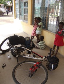 Entretanto, quando eu já estava em modo de despedidas, um dos pequenos curiosos que acompanhara a reparação da minha roda, apareceu com a sua bicicleta na minha frente. Queria que eu reparasse o seu meio de transporte, pois quando ele pedalava, a bicicleta não saía do sítio. Dois segundos bastaram para ver que a sua pequena bicicleta tinha a corrente fora do lugar, razão pela qual o movimento rotativo da pedaleira não era transmitido à roda traseira do seu velocípede.