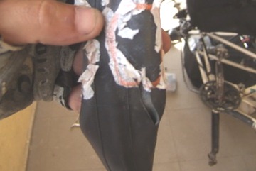 Após umas golfadas de oxigénio para baixar a pulsação, comecei a procurar as ferramentas para desmontar o pneu. Desmontei a roda e pouco depois verifiquei que um dos remendos havia cedido e o ar escapava-se por um cantinho. Defeito da cola ou do remendo? Ou quem sabe até defeito do próprio artesão que reparara a câmara-de-ar, mas certo, eram os 30 minutos perdidos em toda a operação.