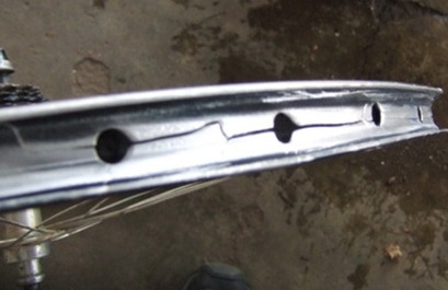 A brecha havia progredido longitudinalmente em quase toda a circunferência do aro. As abas laterais (que seguram o pneu) sofriam de uma deformação permanente para o lado exterior, enquanto na zona central junto aos orifícios de aperto dos raios, já faltavam alguns bocados de material.