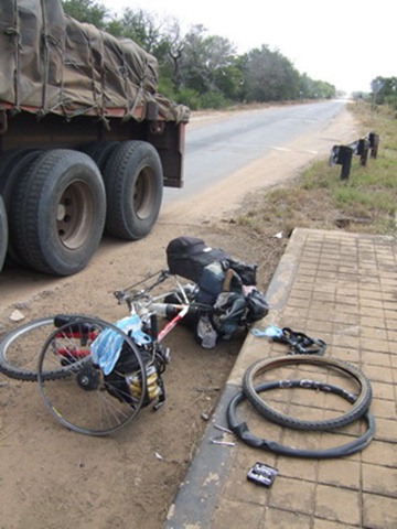 O meu pneu chinês, comprado no Malawi meses antes, resolvera ceder deixando a câmara-de-ar à beira de um iminente estouro.